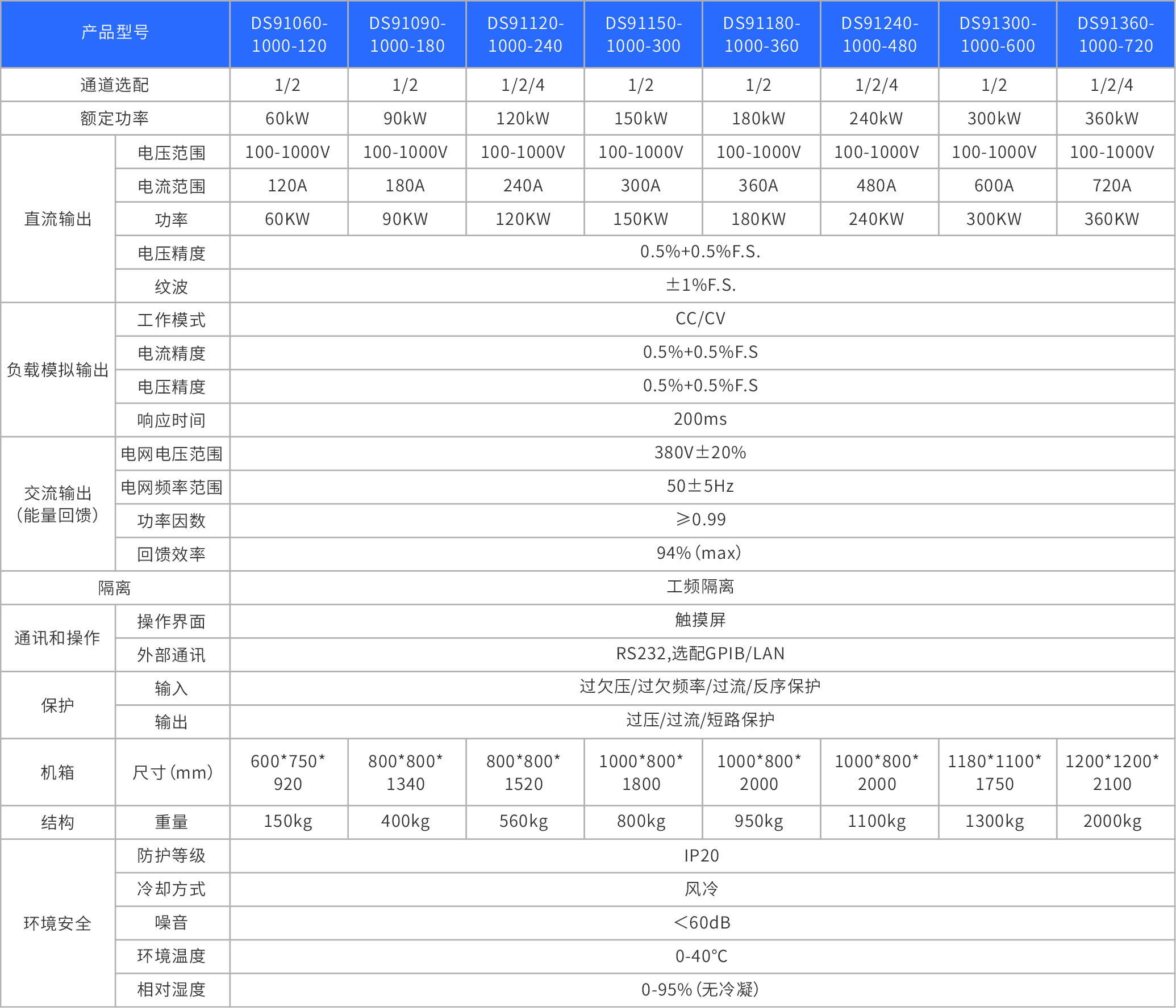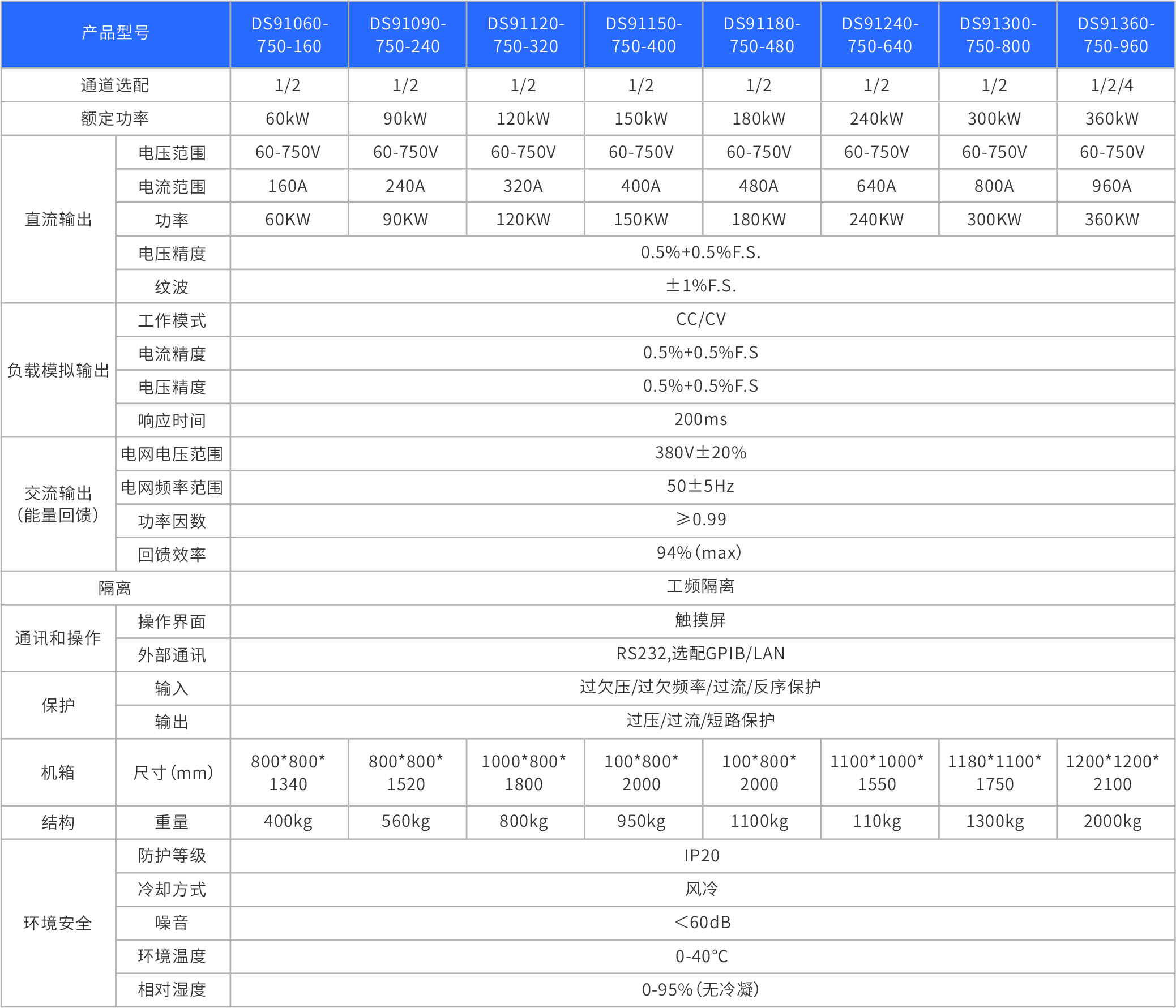 可編程雙向直流電源DS91000系列,是集成直流回饋式負載和直流源功能的雙向系統(tǒng)。該系列可計算電壓、電流測試,有功、無功、功率因數(shù)。