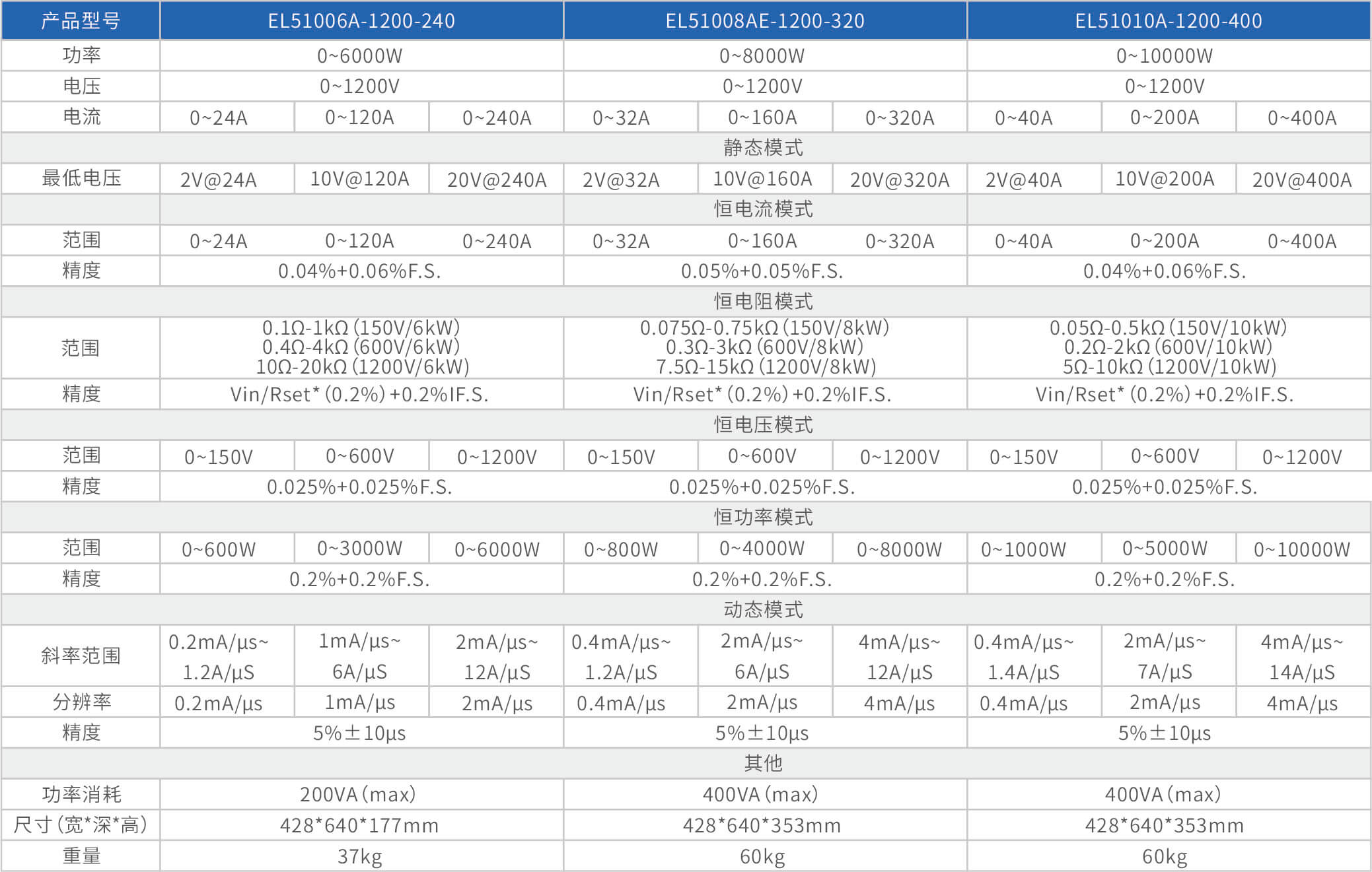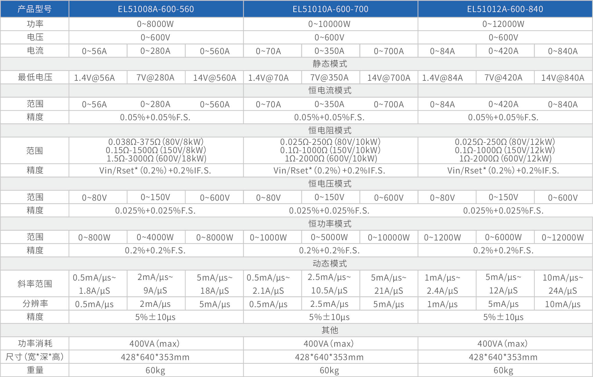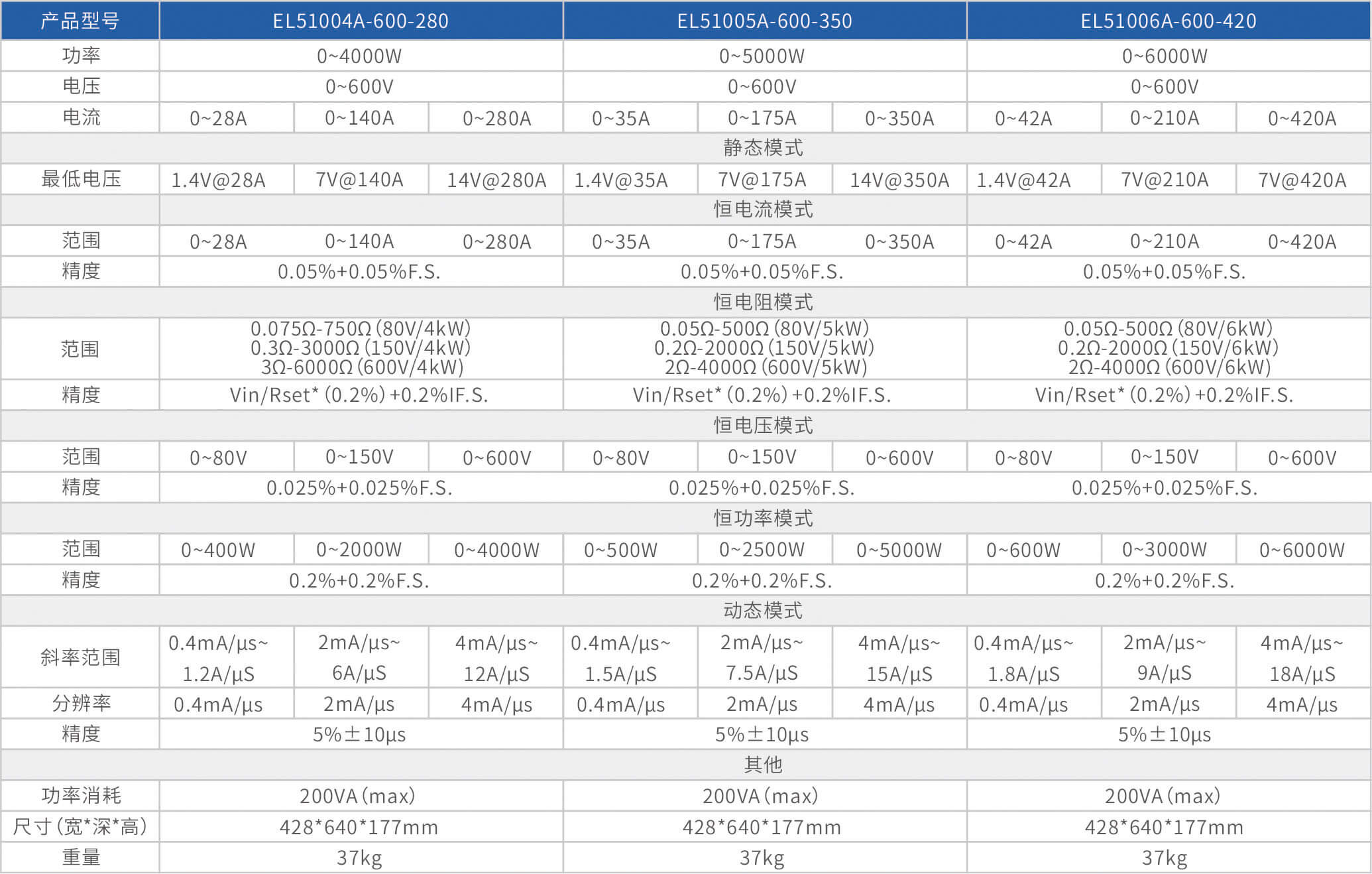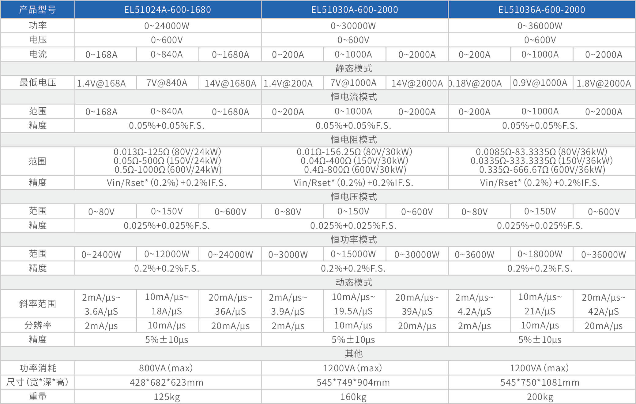 400-800-6892高精度電子負(fù)載EL51000A系列,有150V、600V、1200V三種電壓范圍,功率范圍由2kW至48kW,單一臺(tái)的最大電流可達(dá)2000A;通過(guò)并聯(lián)擴(kuò)展,最大功率更可達(dá)480kW。EL51000A系列負(fù)載具有高功率密度、高控制和測(cè)量精度、高性價(jià)的特點(diǎn);同時(shí)本系列負(fù)載具備同步動(dòng)態(tài),并聯(lián)擴(kuò)展等功能,以及瞬間提供三倍額定功率功能,支持恒電壓CV、恒電流CC、恒電阻CR、恒功率CP四種傳統(tǒng)靜態(tài)加載模式,以及CV+ CC、CR+CC、CV+ CR三種復(fù)合加載模式。