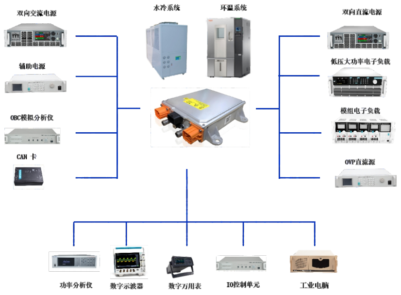 車載充電機OBC&DC-DC研發(fā)測試系統(tǒng)ATS600,專用于各種動力汽車車載電源、車載充電機、電機控制器等產(chǎn)品的電氣特性的實驗室系統(tǒng)。依據(jù)GB/T40432-2011電動汽車用傳導式車載充電機和GB/T24347-2021電動汽車DC/DC變換器國家標準,內(nèi)建實驗室測試項目和極限測試項目,項目覆蓋范圍全,研發(fā)測試速度快。可根據(jù)功率選配不同功率等級設備,支持單向OBC、雙向OBC、OBC+DCDC、DCDC、PUD等多種產(chǎn)品。其模塊化功能設計可以滿足生產(chǎn)、研發(fā)、品質(zhì)測試。